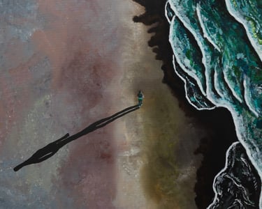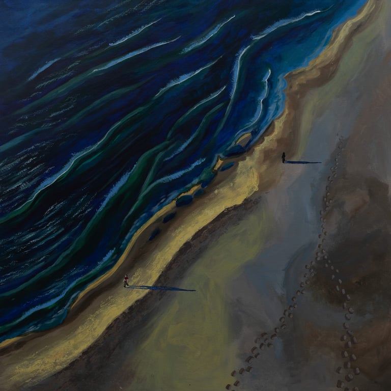 Apie vienišą figūrą, žengiančią taku, kurios šešėlis tampa kelionės draugu, primenančiu, kad esame ne vieni.
